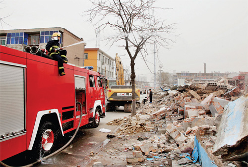 3月3日,忻府區(qū)城南片區(qū)拆遷工作全面展開,為避免城建拆除工作給周邊居民帶來的污染,忻府區(qū)領(lǐng)導(dǎo)迅速行動(dòng),安排部署區(qū)公安消防大隊(duì)消防車在拆遷現(xiàn)場及時(shí)進(jìn)行降塵灑水作業(yè)。圖為降塵灑水現(xiàn)場。(侯睿 攝)