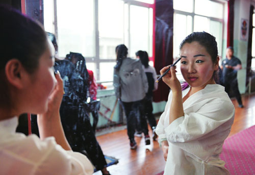 如今的太雨琴是一名北路梆子劇團的演員,隨著走向社會,她越發(fā)感覺到肩頭的重任。傳統(tǒng)戲劇,尤其是北路梆子這樣的地方少數(shù)劇種,那種萬人爭睹的景象已經(jīng)一去不復(fù)返了。現(xiàn)在除了一些縣鄉(xiāng)的節(jié)日慶典,很少有人愿意花錢到劇場觀看。這樣一來,北路梆子也就面臨著演出市場萎縮、大量演員流失的狀況。與其說太雨琴在靠戲曲吃飯,不如說她在用信念堅持。(何光暉 攝影報道)