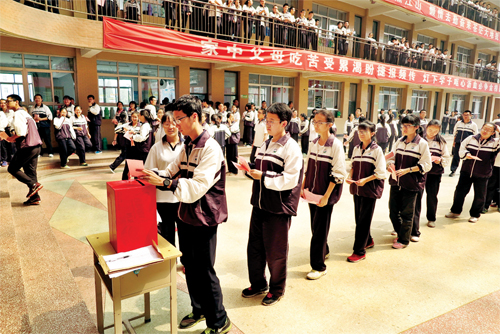 5 月19 日上午,忻州市第一中學(xué)師生利用課間操活動時間,參加忻府區(qū)換屆選舉教育選區(qū)選舉區(qū)人大代表的投票活動。圖為學(xué)生們將填寫好的選票投入投票箱。(魯明強 攝)