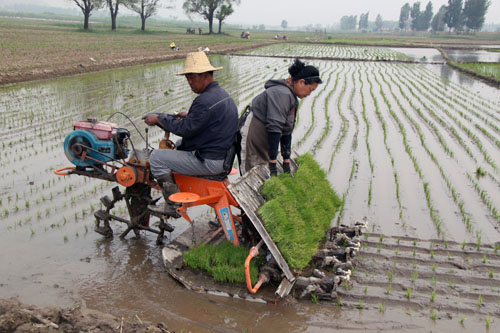 5 月31 日,原平市東營村的稻田里機聲隆隆,一派繁忙景象,農(nóng)機員正駕駛著鐵牛在插秧。這是該村頭一回用上了現(xiàn)代化的插秧機種植水稻。村民們高興地說:“如今惠農(nóng)政策就是好,現(xiàn)代農(nóng)機化作業(yè)為俺農(nóng)民種田致富插上了金翅膀?!保ㄚw春曉 攝)