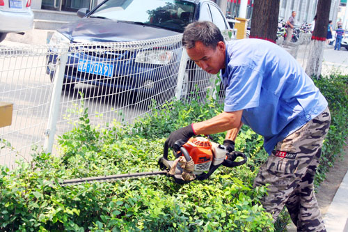 進(jìn)入暑期以來,赤日炎炎,驕陽似火。7月31日,原平市城建園林管理人員冒著暑熱正在前進(jìn)大街為綠化帶樹木進(jìn)行修剪,防暑解熱梳妝。該市對花草樹木堅(jiān)持科學(xué)管理常態(tài)化,確保了健康成長枝繁葉茂。(趙月仁 攝)