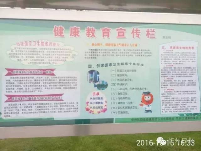(四)為了突出創(chuàng)衛(wèi)這個詞語,我選用了健康教育宣傳欄和正在進行對這個城市面貌修飾的工人,還有我們學校附近的街心花園新修的一個花圃。(崔風琴 攝)