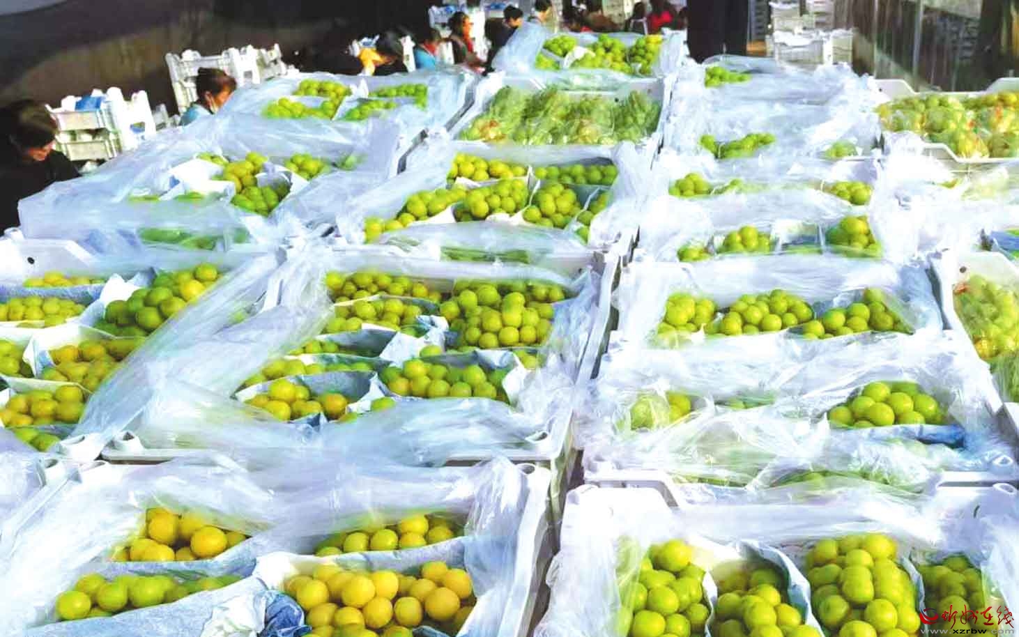 原平市田家莊村陽光玫瑰葡萄是當(dāng)?shù)靥厣N植產(chǎn)業(yè)。豐收季,210畝優(yōu)質(zhì)葡萄經(jīng)過采摘和精細(xì)分揀,便立即送入冷庫保鮮,隨后通過冷鏈物流發(fā)往各地市場(chǎng),成為助推鄉(xiāng)村振興的“甜蜜產(chǎn)業(yè)”。圖為工人們正在分揀堆至人高的葡萄。 (記者 范琛攝)