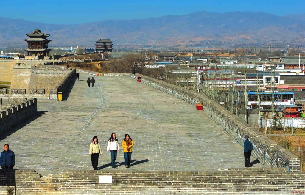 代州古城西城墻歷經(jīng)多年保護(hù)性修繕,是古城目前唯一修復(fù)完整并對(duì)外開(kāi)放的城墻段落。圖為12月1日,游人登上西城墻游覽觀光。(王晉東攝)