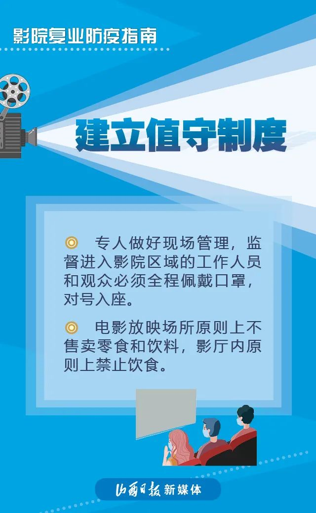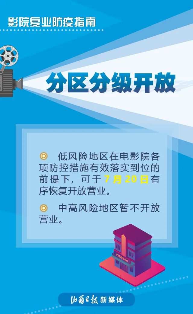 近日,國家電影局發(fā)布《關于在疫情防控常態(tài)化條件下有序推進電影院恢復開放的通知》稱,低風險地區(qū)在電影院各項防控措施有效落實到位的前提下,可于7月20日有序恢復開放營業(yè)。具體要求如下↓↓↓
