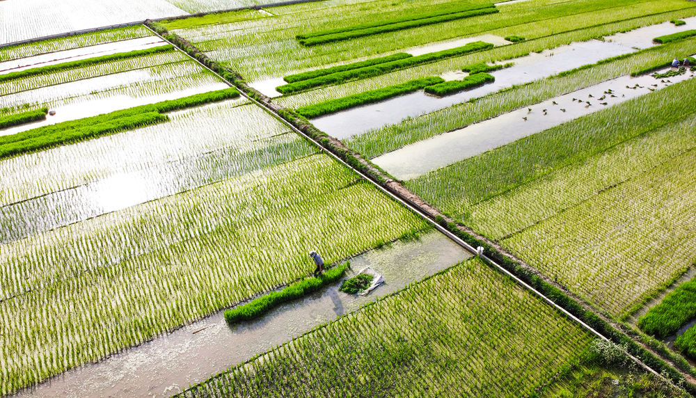 2020年6月14日,農(nóng)民在洛陽市孟津縣會盟鎮(zhèn)黃河岸邊的萬畝優(yōu)質(zhì)水稻種植示范基地內(nèi)移栽水稻秧苗(無人機照片)。新華社發(fā)(黃政偉 攝)