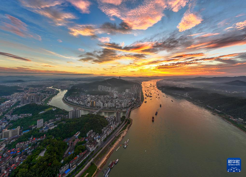 9月16日清晨在廣西梧州拍攝的西江水域朝霞(無(wú)人機(jī)照片)。(新華社發(fā) 何華文 攝)