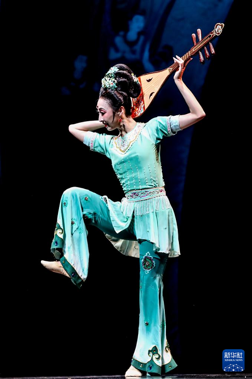 9月20日晚,演員在敦煌大劇院表演新版《絲路花雨》,展示經(jīng)典舞姿“反彈琵琶”。(新華社記者 郎兵兵 攝)