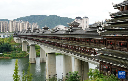 這是9月25日拍攝的三江侗族自治縣的宜陽風(fēng)雨橋。該橋橫跨潯江之上,全長(zhǎng)399.6米,寬28米。橋面設(shè)雙向四車道,橋上共兩層,二層建有跨橋人行通道。(新華社記者 張楓 攝)