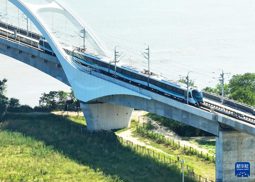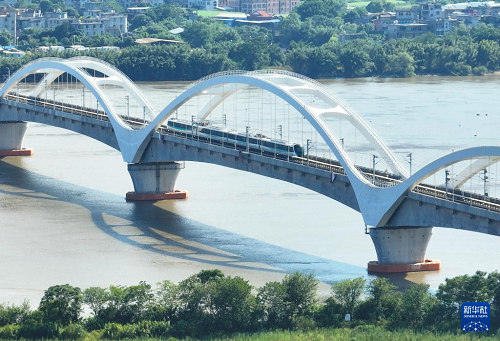 9月29日,列車駛?cè)霝I海快線帝封江站(無人機(jī)照片)。(新華社記者 林善傳 攝)