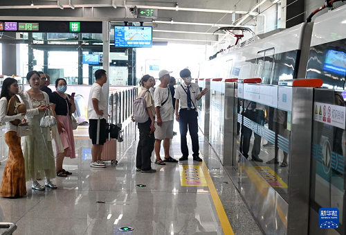 9月29日,人們?cè)跒I海快線帝封江站等候前往福州長(zhǎng)樂國(guó)際機(jī)場(chǎng)的列車。(新華社記者 林善傳 攝)
