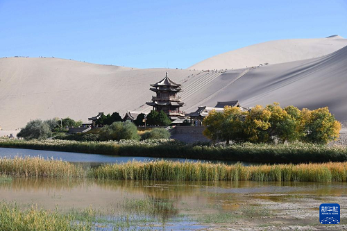 金秋時節(jié),甘肅省敦煌市鳴沙山月牙泉景區(qū)景色如畫,眾多游客徜徉其中,感受大漠風情。