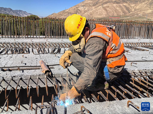施工人員在薩熱路跨江大橋建設(shè)現(xiàn)場(chǎng)工作(10月13日攝)。(新華社發(fā) 帥卿 攝)