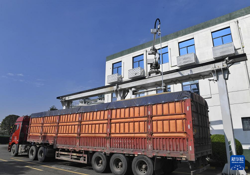 10月15日,在中儲(chǔ)糧成都青白江倉儲(chǔ)有限責(zé)任公司,智能扦檢平臺(tái)在對(duì)剛運(yùn)來的糧食進(jìn)行隨機(jī)扦取樣品操作。(新華社記者 劉坤 攝)