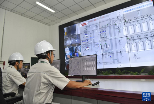 10月15日,在中儲(chǔ)糧成都青白江倉儲(chǔ)有限責(zé)任公司,技術(shù)人員在淺圓倉工作塔控制中心(中控室)操作糧倉入庫設(shè)備、通風(fēng)設(shè)備和視頻監(jiān)控系統(tǒng)。(新華社記者 劉坤 攝)