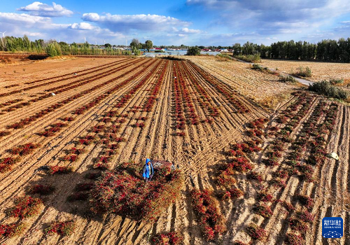 10月19日,在通遼市開魯縣東風鎮(zhèn)六合堂村,村民在田地里收獲干椒(無人機照片)。(新華社記者 連振 攝)