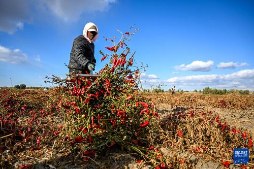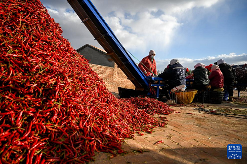 10月19日,在通遼市開魯縣東風鎮(zhèn)六合堂村,村民在分揀紅干椒。(新華社記者 連振 攝)