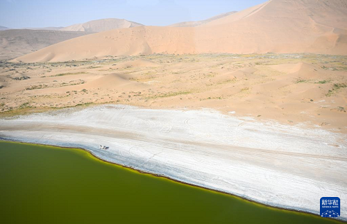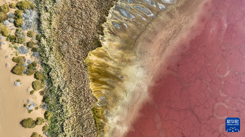 10月22日拍攝的巴丹吉林沙漠中的紅海子(無人機照片)。(新華社記者 貝赫 攝)