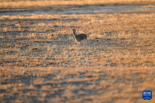 10月21日,一只藏原羚在甘肅省阿克塞哈薩克族自治縣阿勒騰鄉(xiāng)哈爾騰高原覓食張望。(新華社發(fā) 高宏善 攝)