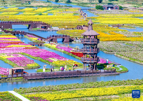 10月23日,游客在江蘇省興化市千垛景區(qū)賞菊游玩(無人機(jī)照片)。(新華社發(fā) 周社根 攝)