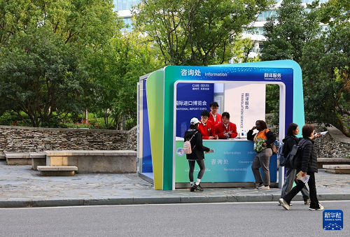 11月3日,志愿者在國家會展中心(上海)的一個咨詢處內(nèi)工作。(新華社記者 方喆 攝)