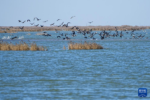 11月13日,山東黃河三角洲國(guó)家級(jí)自然保護(hù)區(qū)內(nèi),越冬候鳥(niǎo)在飛翔。(新華社記者 朱崢 攝)