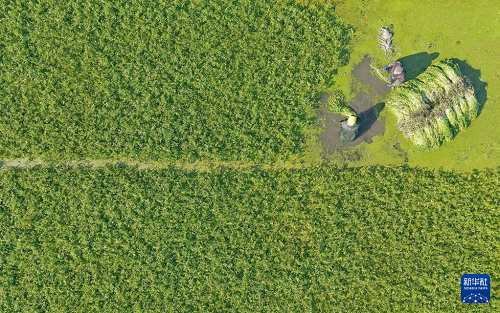 12月7日,江蘇省海安市墩頭鎮(zhèn)長垎村水芹菜種植基地,菜農(nóng)在水田里采收水芹菜(無人機(jī)照片)。(新華社發(fā) 周強(qiáng) 攝)