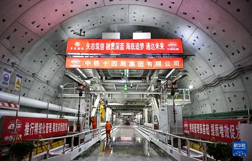12月15日,中鐵十四局建設(shè)者在海平面下91米進(jìn)行管片安裝作業(yè)。(新華社記者 李紫恒 攝)
