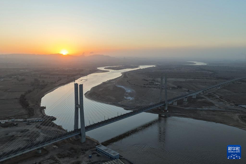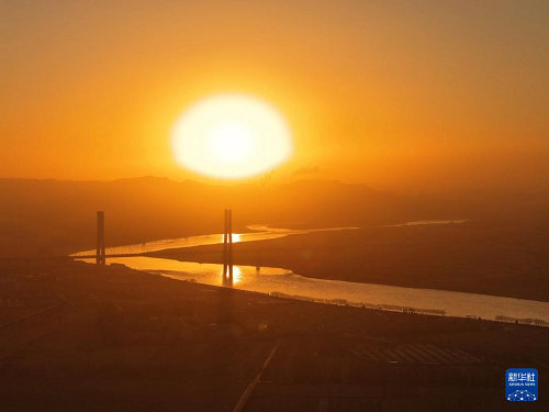 12月23日在日出時(shí)分拍攝的包銀高鐵烏海黃河特大橋。(新華社記者 邢廣利 攝)
