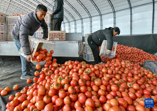 12月29日,肅寧縣萬(wàn)里鎮(zhèn)一家蔬菜種植合作社的社員將收獲的西紅柿卸車(chē)。(新華社記者 楊世堯 攝)