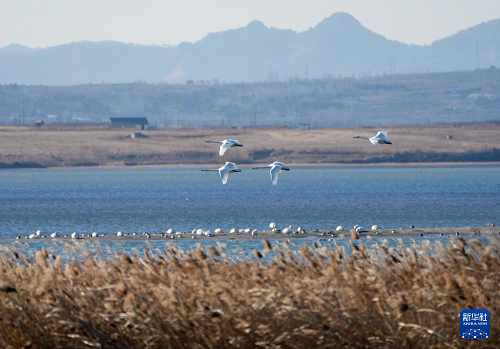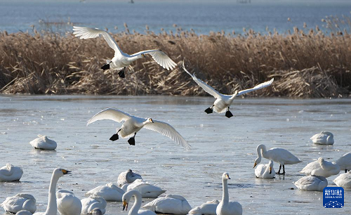 1月5日,大天鵝在榮成大天鵝國家級自然保護區(qū)飛翔。(新華社記者 徐速繪 攝)