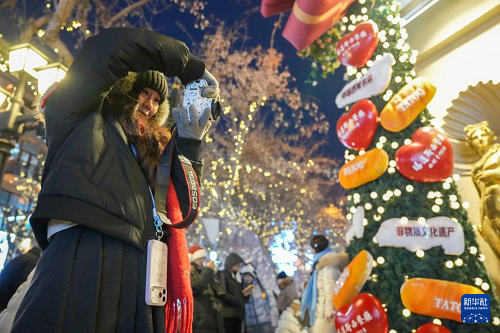 1月8日,游客在哈爾濱中央大街游玩拍照。(新華社記者 王建威 攝)