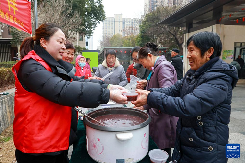 1月25日,在河北省唐山市豐潤(rùn)區(qū)燕山路街道欣園社區(qū),環(huán)衛(wèi)工人品嘗志愿者送來(lái)的臘八粥。(新華社發(fā) 朱大勇 攝)