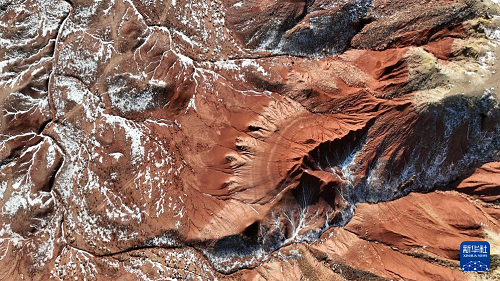 紅崖臺地位于內(nèi)蒙古烏蘭察布市四子王旗北部,是內(nèi)蒙古四子王國家地質(zhì)公園的重要組成部分。這里山丘聳立、溝壑縱橫,山體呈現(xiàn)赤紅色。隆冬時節(jié),稀薄殘雪點綴其間,在蒼茫天地中勾勒出一幅靜謐而壯麗的自然畫卷。