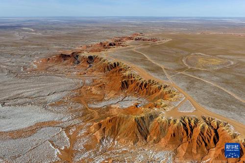 這是1月29日在內(nèi)蒙古烏蘭察布市四子王旗拍攝的紅崖臺地景觀(無人機照片)。(新華社記者 貝赫 攝)
