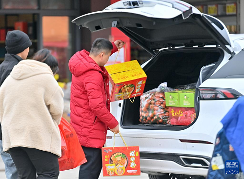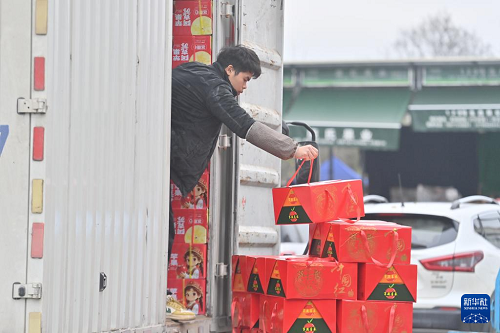 2月11日,在柳州市柳南區(qū)瑞龍路一家農(nóng)產(chǎn)品批發(fā)市場(chǎng),市民將年貨搬上車。(新華社記者 黃孝邦 攝)