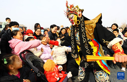 2月10日,在河南省周口市川匯區(qū)關(guān)帝廟廣場,進(jìn)行表演的民間藝人與觀眾互動(dòng)。(新華社發(fā) 高建中 攝)