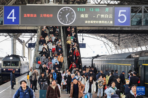 2月13日,旅客在南京火車站乘車出行。(新華社發(fā) 蘇陽(yáng) 攝)