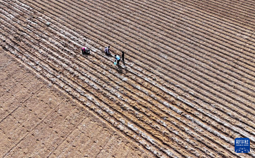2月13日,在山東省棗莊市山亭區(qū)桑村鎮(zhèn),農(nóng)民在播種馬鈴薯(無人機(jī)照片)。(新華社發(fā) 李宗憲 攝)