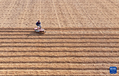 2月13日,在山東省棗莊市山亭區(qū)桑村鎮(zhèn),農(nóng)民駕駛農(nóng)機(jī)開溝準(zhǔn)備播種馬鈴薯(無人機(jī)照片)。(新華社發(fā) 李宗憲 攝)