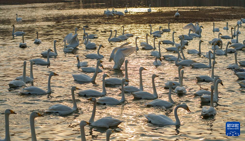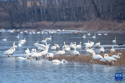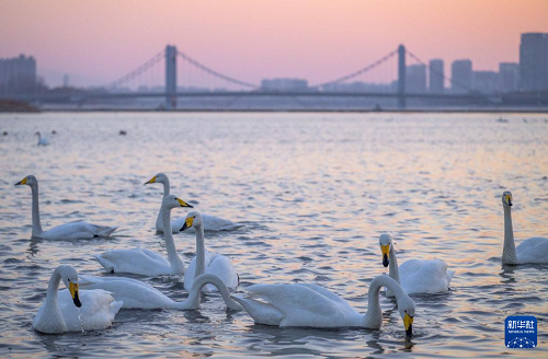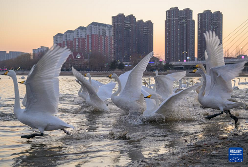 冬季以來,大批天鵝飛臨遼寧省朝陽市大凌河棲息越冬,吸引人們前來觀賞和拍照。