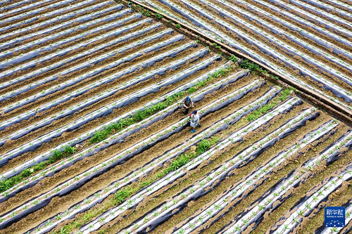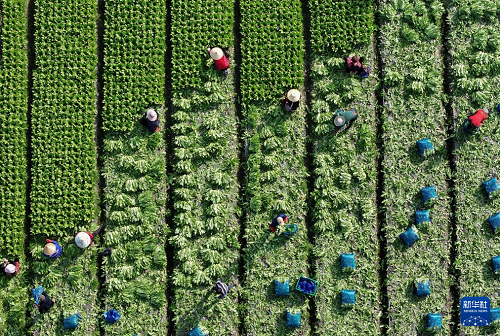 2月24日,農(nóng)民在四川成都市彭州市九尺鎮(zhèn)玉源社區(qū)的田地里采收油麥菜(無人機(jī)照片)。(新華社發(fā) 羅國楊 攝)