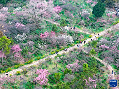 2月25日,游客在江蘇南京明孝陵梅花山上賞梅踏春(無人機(jī)照片)。(新華社發(fā) 楊素平 攝)