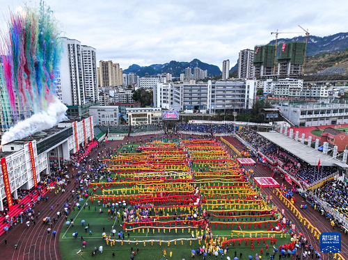 這是2月27日拍攝的貴州省石阡縣仡佬毛龍節(jié)開(kāi)幕式現(xiàn)場(chǎng)(無(wú)人機(jī)照片)。(新華社記者 楊文斌 攝)