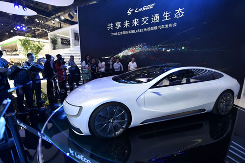 4月25日,觀眾在參觀車展展出的樂視電動(dòng)汽車。當(dāng)日,2016(第十四屆)北京國(guó)際汽車展覽會(huì)在京開幕。新華社記者鞠煥宗攝