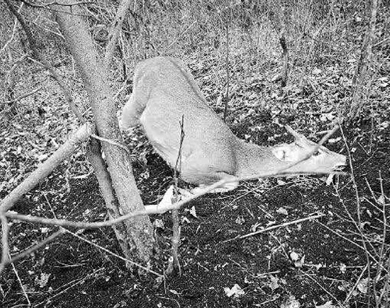 野生梅花鹿,左前腿被吊住,整個軀體呈半懸空狀態(tài),不停痛苦掙扎。