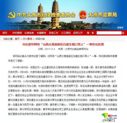 太原市紀(jì)委網(wǎng)站截圖 中國(guó)青年網(wǎng)北京2月6日電(記者 吳陽(yáng) 王子瑞) 去年12月29日中國(guó)青年網(wǎng)報(bào)道了《被違規(guī)開(kāi)發(fā)商糾纏 太原高新區(qū)一官員1分鐘連爆9句粗口》事件。昨天,太原市紀(jì)委官方網(wǎng)站公布了對(duì)此事的處理結(jié)果。市紀(jì)委報(bào)經(jīng)市委同意后,決定對(duì)白建生誡勉談話,責(zé)令其寫(xiě)出深刻檢查,要求其在高新區(qū)黨工委民主生活會(huì)上認(rèn)真查擺問(wèn)題,反思剖析;并責(zé)成高新區(qū)管委會(huì)依法依規(guī)盡快對(duì)該企業(yè)違法建設(shè)行為作出處理。 去年12月底,一段名為《山西太原:高新區(qū)官員對(duì)投資方一分鐘談話九個(gè)“他媽X”》的視頻在山西當(dāng)?shù)亓鱾?。在這段視頻中,太原高新區(qū)管委會(huì)副主任白建生對(duì)一男子說(shuō)“他媽X,他找死是不是,他以為他那個(gè)地方出來(lái)的土豹子,太原市就放不下他了”。男子說(shuō),“改天坐一坐”。白建生說(shuō),“我和他坐?我還嫌他媽丟人,見(jiàn)了他?別和他坐了”。男子說(shuō),“企業(yè)不是著急了?”。白建生反問(wèn),“著急啥?那你想干啥就干啥來(lái)。那是自己傻X,做的事情你媽X。問(wèn)我就是,我就在這坐著,第二天來(lái)了是,‘你到底給辦不辦?’”,“他以為高新區(qū)多年他媽X軟X?”。
