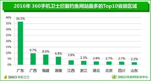 360大數(shù)據(jù)對釣魚網(wǎng)站地域分布也進行了精準分析,整體來看,手機端釣魚網(wǎng)站攔截量占比最高的地區(qū)為廣東省,以壓倒性的36.5%位居榜首;其次為廣西(9.7%)、福建(8.6%)、湖南(6.8%)和江西(3.8%)。
