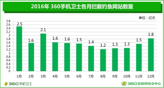 釣魚網(wǎng)站的活躍期也存在差異。360專家表示,綜合2016年各月的釣魚網(wǎng)站攔截量情況,可以看出全年的釣魚網(wǎng)站活躍程度呈現(xiàn)中間低、兩頭高的特點。1月份釣魚網(wǎng)站攔截量最高,達到2.5億,8月最低(1.2億次)。