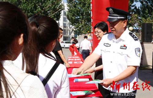 市公安局局長楊梅喜向?qū)W生們發(fā)放禁毒宣傳資料
